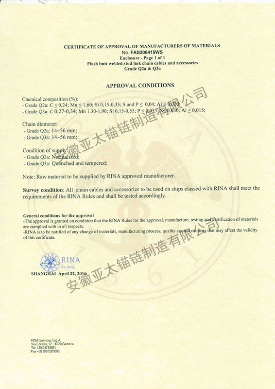 安徽亞太錨鏈制造有限公司是國家高新技術企業(yè),也是國家GB/T 549-2017《電焊錨鏈》標準的起草和制定單位之一。公司旗下設有錨鏈分廠、浮標分廠、舾裝件分廠等多個分廠。公司專業(yè)從事φ12.5mm-φ107mm二、三級船用錨鏈、浮標錨鏈、錨鏈附件,錨、船舶曬裝產品、航標、系船浮、船型標、多種規(guī)格海洋監(jiān)測浮標及航標燈等產品的生產、安裝和服務。目前公司的產品銷往全國各地船廠、碼頭、航標處、航道局、海洋局,并已走上國際市場,如東南亞、中東、歐美等國家。